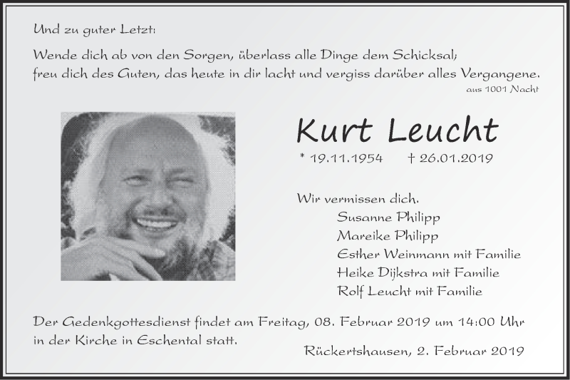 Hier finden Sie alle Traueranzeigen aus der Zeitung, die bisher für Kurt Leucht erschienen sind. Weitere Traueranzeigen, die in der Zeitung erscheinen, werden hier ebenfalls aufgelistet
