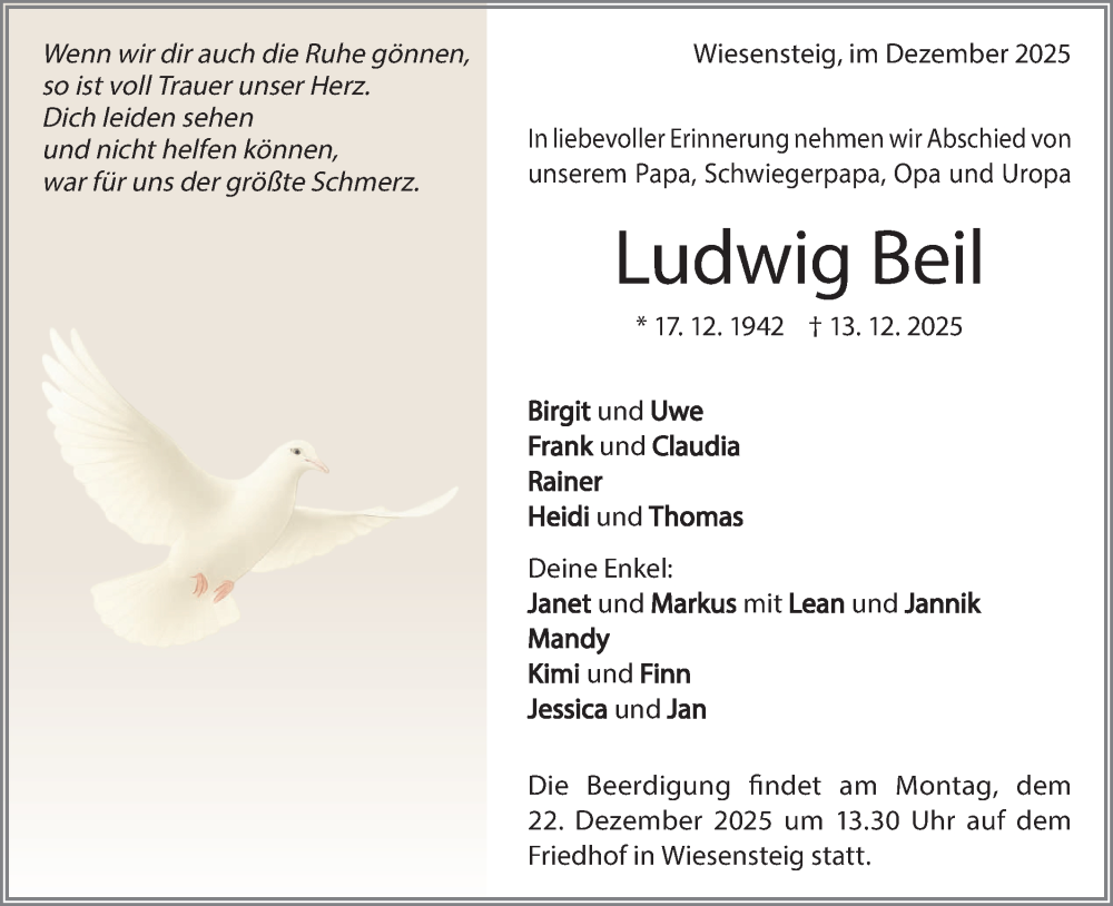 Hier finden Sie alle Traueranzeigen aus der Zeitung, die bisher für Ludwig Beil erschienen sind. Weitere Traueranzeigen, die in der Zeitung erscheinen, werden hier ebenfalls aufgelistet