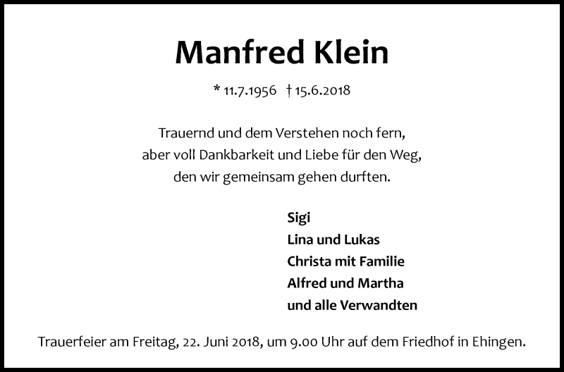 Hier finden Sie alle Traueranzeigen aus der Zeitung, die bisher für Manfred Klein erschienen sind. Weitere Traueranzeigen, die in der Zeitung erscheinen, werden hier ebenfalls aufgelistet