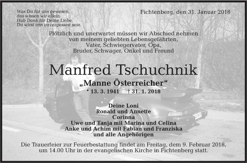 Hier finden Sie alle Traueranzeigen aus der Zeitung, die bisher für Manfred Tschuchnik erschienen sind. Weitere Traueranzeigen, die in der Zeitung erscheinen, werden hier ebenfalls aufgelistet