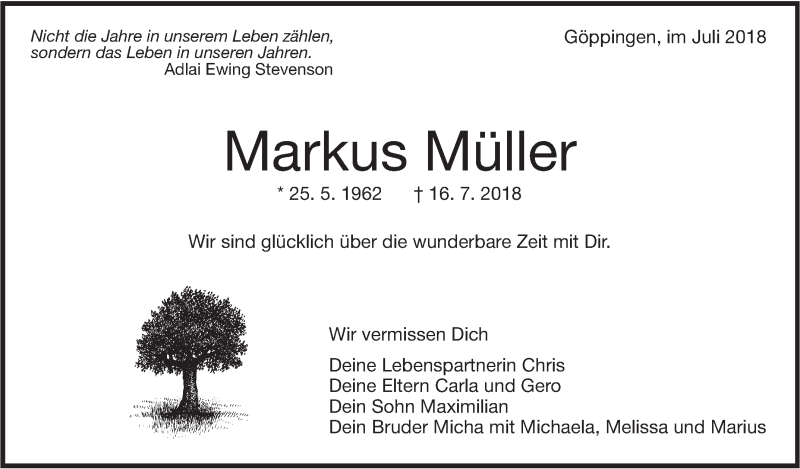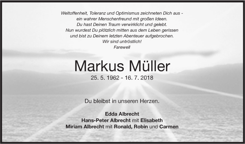 Hier finden Sie alle Traueranzeigen aus der Zeitung, die bisher für Markus Müller erschienen sind. Weitere Traueranzeigen, die in der Zeitung erscheinen, werden hier ebenfalls aufgelistet