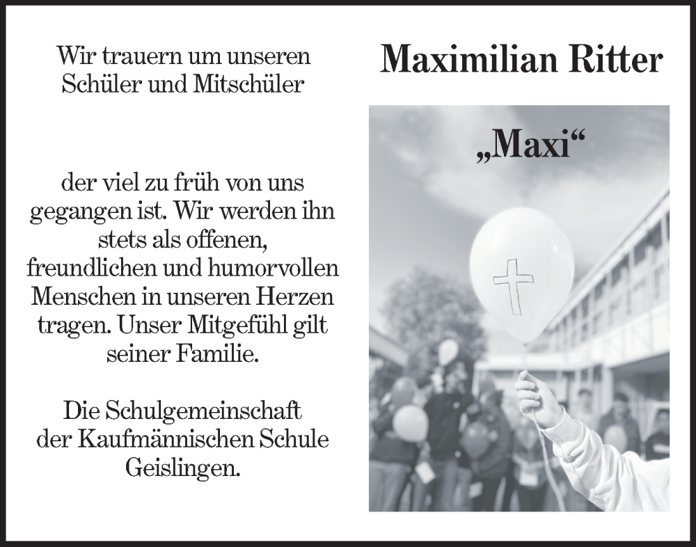 Hier finden Sie alle Traueranzeigen aus der Zeitung, die bisher für Maximilian Ritter erschienen sind. Weitere Traueranzeigen, die in der Zeitung erscheinen, werden hier ebenfalls aufgelistet
