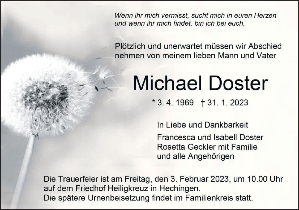 Hier finden Sie alle Traueranzeigen aus der Zeitung, die bisher für Michael Doster erschienen sind. Weitere Traueranzeigen, die in der Zeitung erscheinen, werden hier ebenfalls aufgelistet
