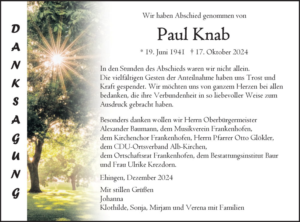 Hier finden Sie alle Traueranzeigen aus der Zeitung, die bisher für Paul Knab erschienen sind. Weitere Traueranzeigen, die in der Zeitung erscheinen, werden hier ebenfalls aufgelistet