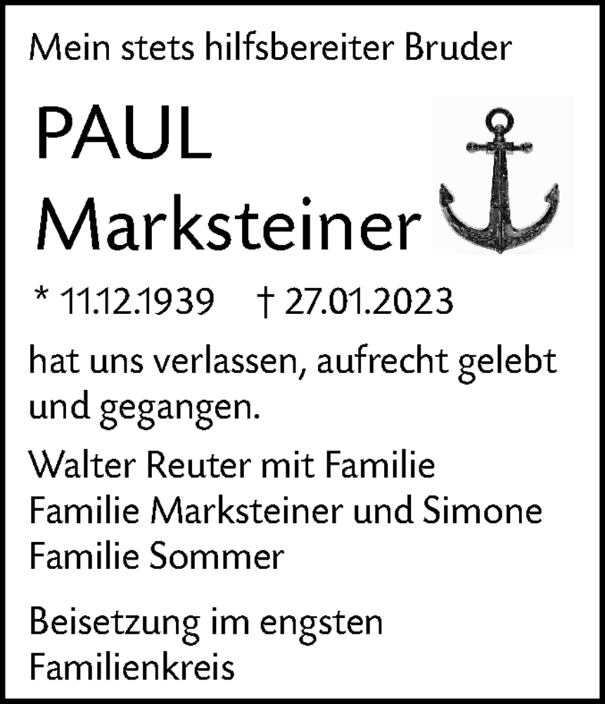 Hier finden Sie alle Traueranzeigen aus der Zeitung, die bisher für Paul Marksteiner erschienen sind. Weitere Traueranzeigen, die in der Zeitung erscheinen, werden hier ebenfalls aufgelistet