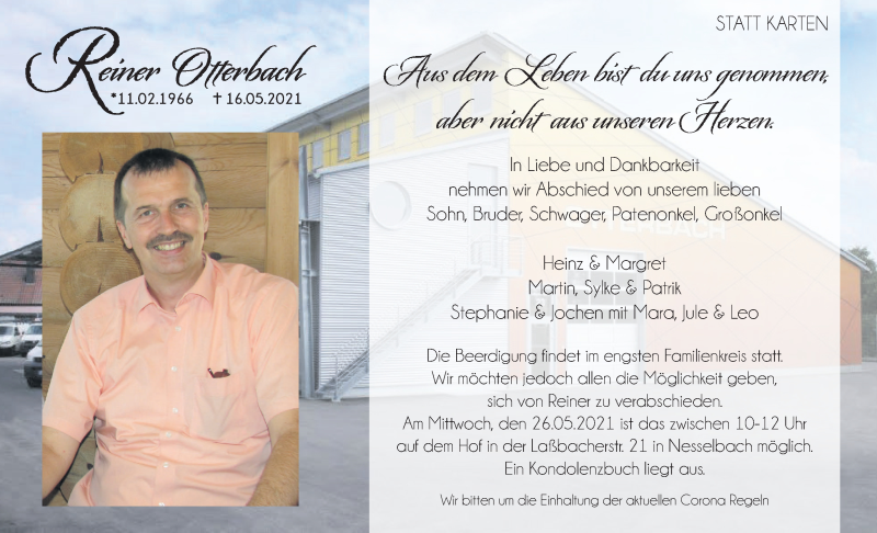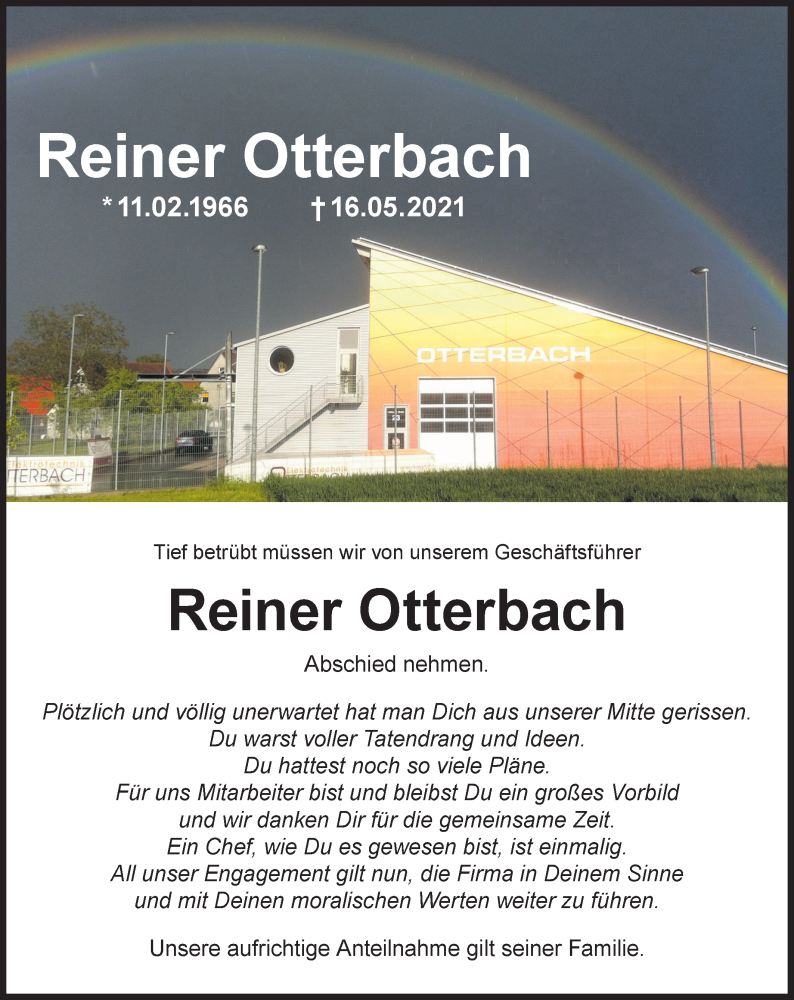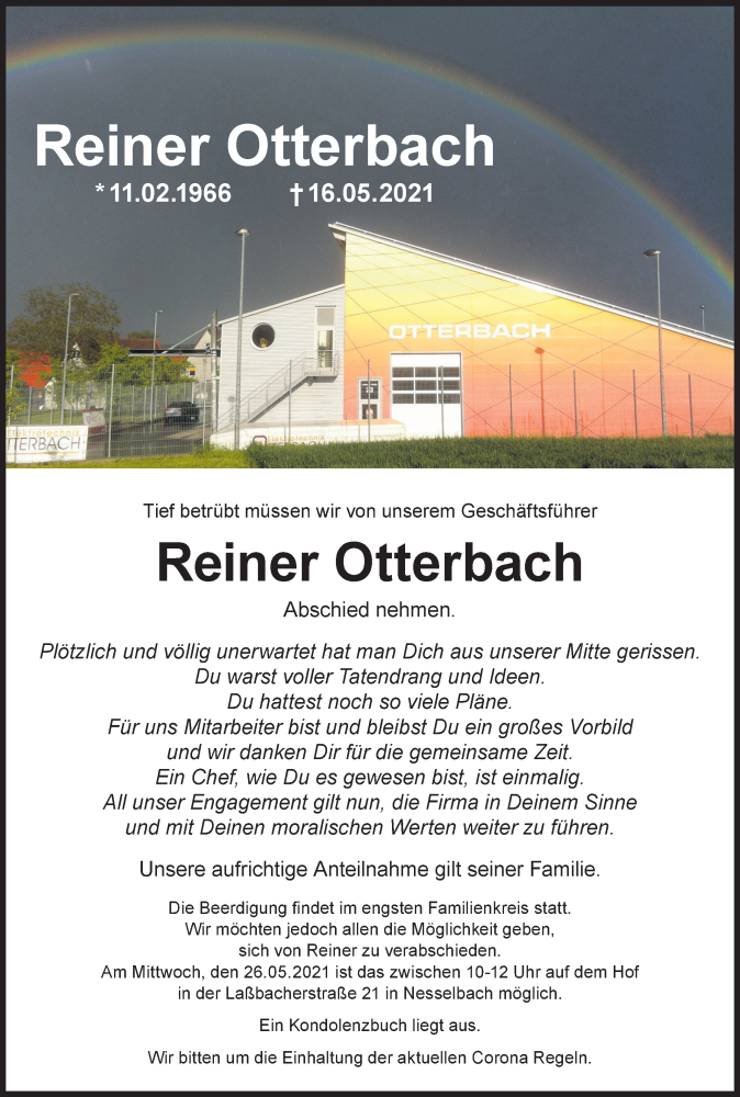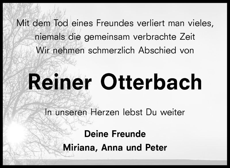 Hier finden Sie alle Traueranzeigen aus der Zeitung, die bisher für Reiner Otterbach erschienen sind. Weitere Traueranzeigen, die in der Zeitung erscheinen, werden hier ebenfalls aufgelistet