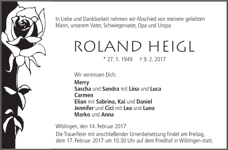 Hier finden Sie alle Traueranzeigen aus der Zeitung, die bisher für Roland Heigl erschienen sind. Weitere Traueranzeigen, die in der Zeitung erscheinen, werden hier ebenfalls aufgelistet