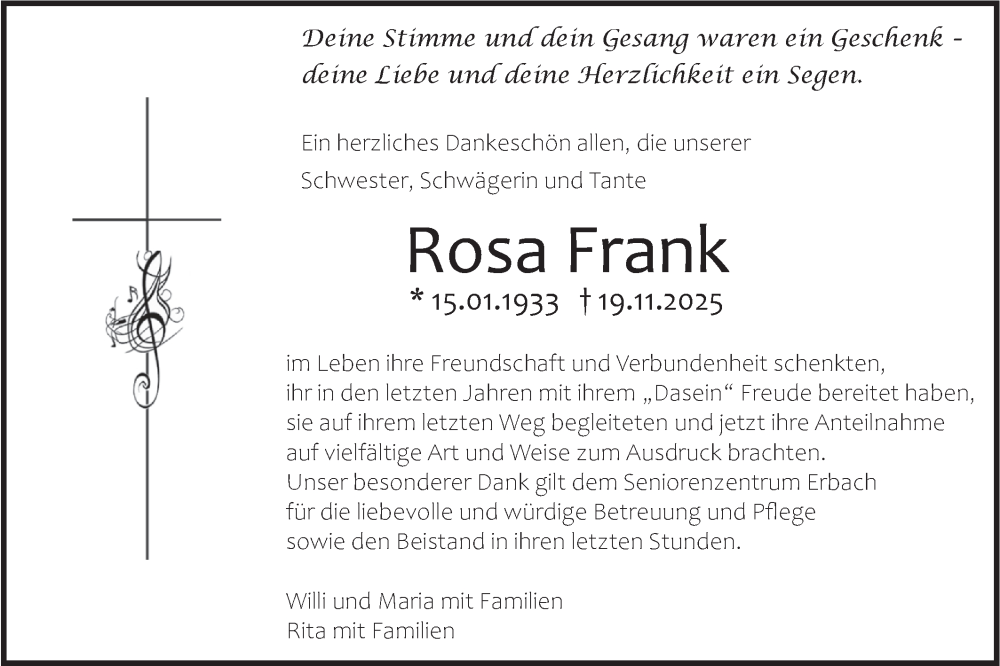 Hier finden Sie alle Traueranzeigen aus der Zeitung, die bisher für Rosa Frank erschienen sind. Weitere Traueranzeigen, die in der Zeitung erscheinen, werden hier ebenfalls aufgelistet
