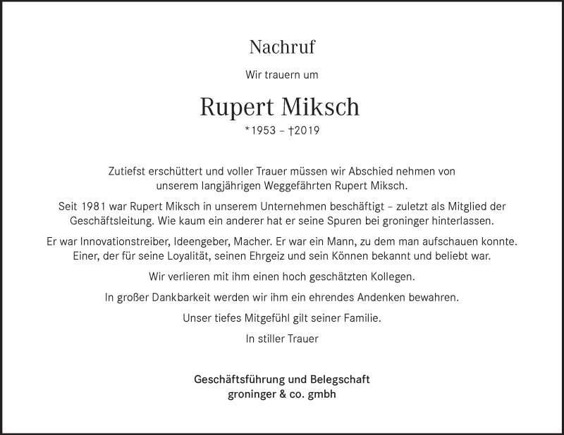 Hier finden Sie alle Traueranzeigen aus der Zeitung, die bisher für Rupert Miksch erschienen sind. Weitere Traueranzeigen, die in der Zeitung erscheinen, werden hier ebenfalls aufgelistet