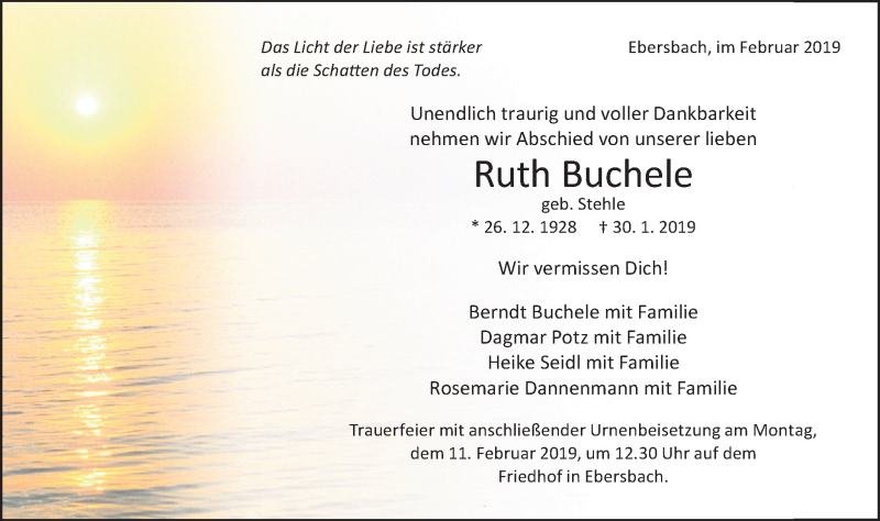 Hier finden Sie alle Traueranzeigen aus der Zeitung, die bisher für Ruth Buchele erschienen sind. Weitere Traueranzeigen, die in der Zeitung erscheinen, werden hier ebenfalls aufgelistet