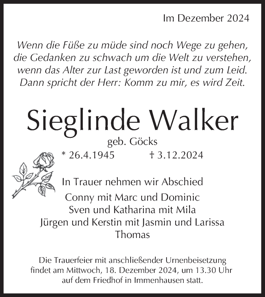 Hier finden Sie alle Traueranzeigen aus der Zeitung, die bisher für Sieglinde Walker erschienen sind. Weitere Traueranzeigen, die in der Zeitung erscheinen, werden hier ebenfalls aufgelistet