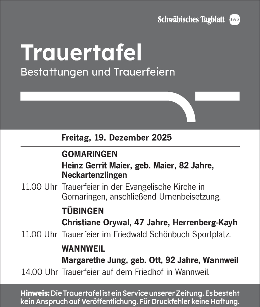 Hier finden Sie alle Traueranzeigen aus der Zeitung, die bisher für Totentafel vom 19.12.2025 erschienen sind. Weitere Traueranzeigen, die in der Zeitung erscheinen, werden hier ebenfalls aufgelistet