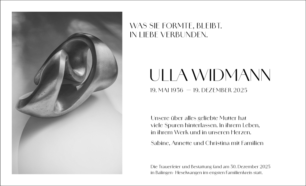 Hier finden Sie alle Traueranzeigen aus der Zeitung, die bisher für Ulla Widmann erschienen sind. Weitere Traueranzeigen, die in der Zeitung erscheinen, werden hier ebenfalls aufgelistet