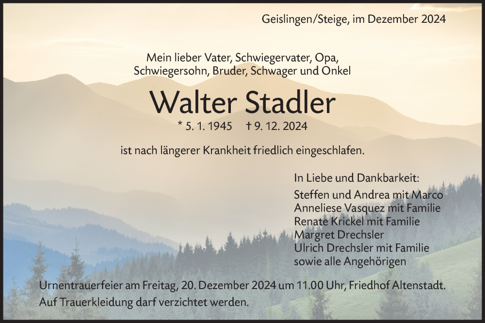 Hier finden Sie alle Traueranzeigen aus der Zeitung, die bisher für Walter Stadler erschienen sind. Weitere Traueranzeigen, die in der Zeitung erscheinen, werden hier ebenfalls aufgelistet