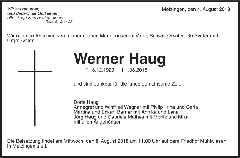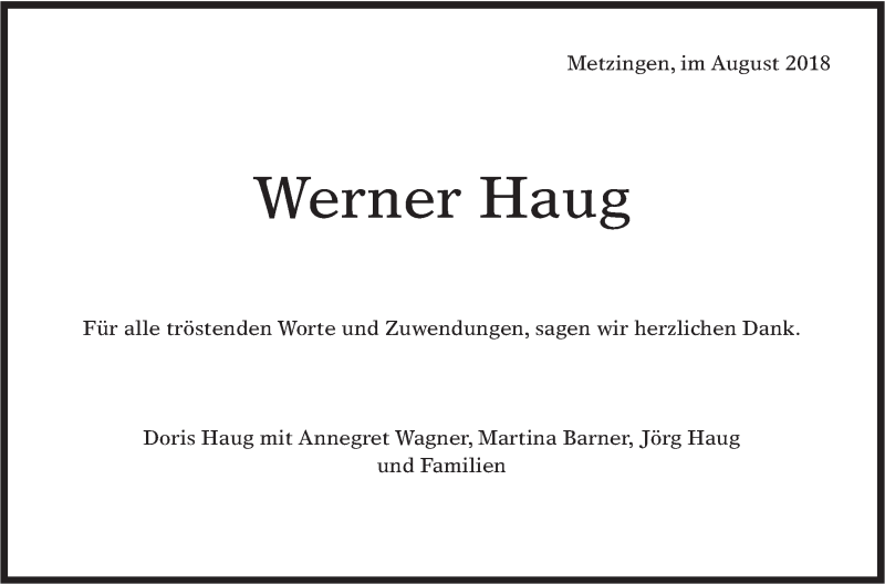 Hier finden Sie alle Traueranzeigen aus der Zeitung, die bisher für Werner Haug erschienen sind. Weitere Traueranzeigen, die in der Zeitung erscheinen, werden hier ebenfalls aufgelistet